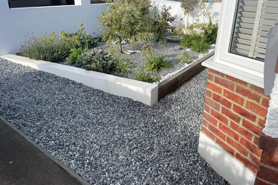 Rectified a front garden drainage issue, tidied the crumbling edge of driveway + dressed with decorative stone to match existing.