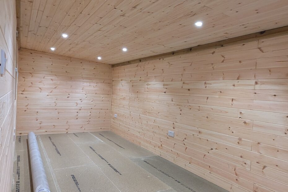Transformed a large shed into an insulated art studio with pine interior, electrics, interior and exterior lighting, composite door and floor to ceiling double glazed UPVC window and new floor.